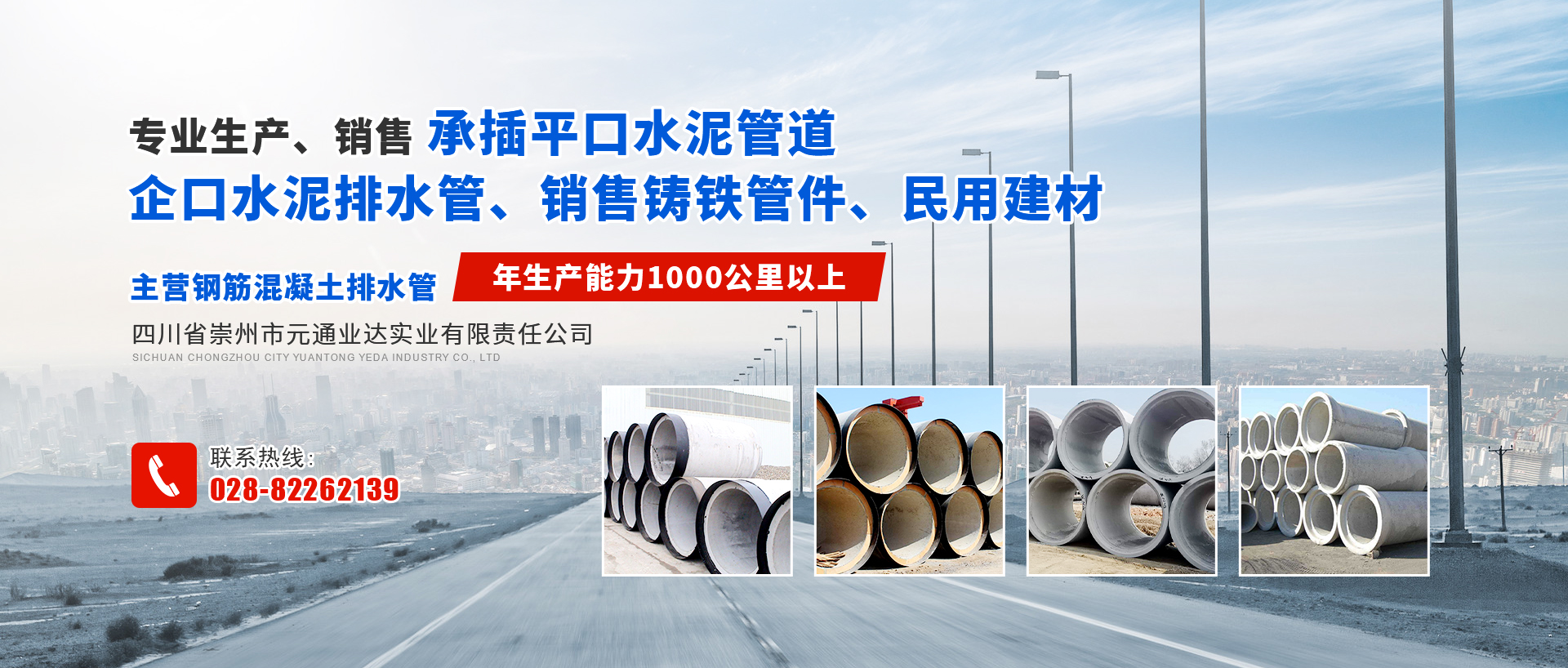 四川省崇州市元通業達實業有限責任公司是專業生產、銷售承插平口水泥管道、企口水泥排水管、銷售鑄鐵管件、民用建材的企業。自創辦以來,本著誠信經營的原則,積極進取、勇于開拓,經過多年的努力拼搏,隨企業不斷拓展壯大,企業于2002年8月26日重組注冊四川省崇州市元通業達實業有限責任公司,法人代表為王自立。 目前鋼筋混凝土排水管是公司的主導產品。管徑:Φ200——Φ3550mm,長度2000—2500mm。公司有多條生產線,年生產能力1000公里以上,產品還有與管道安...